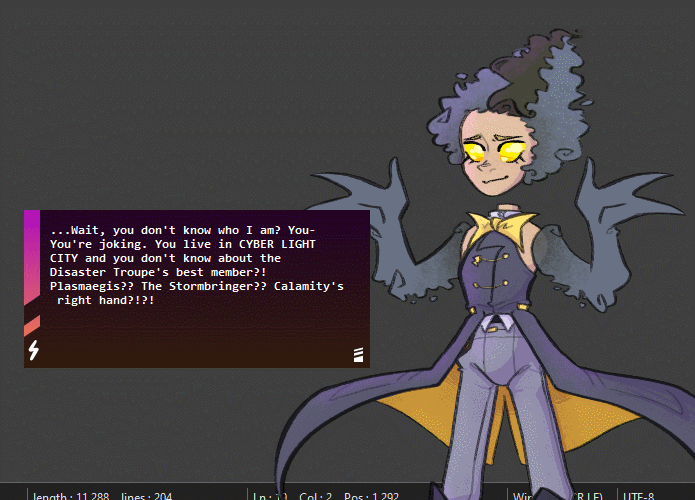 Not much is in them in terms of features or dialogue, as this was mostly a world building and art exercise for me :3 You can use them as pretty desktop decorations, maybe?Future features include more dialogue (always), user information (like species and resonance color), and a combat system!! Bramblebrush has an interesting runic magic system that I want to get around to coding, so yeah :>|| FAEIA & TAHIR ||